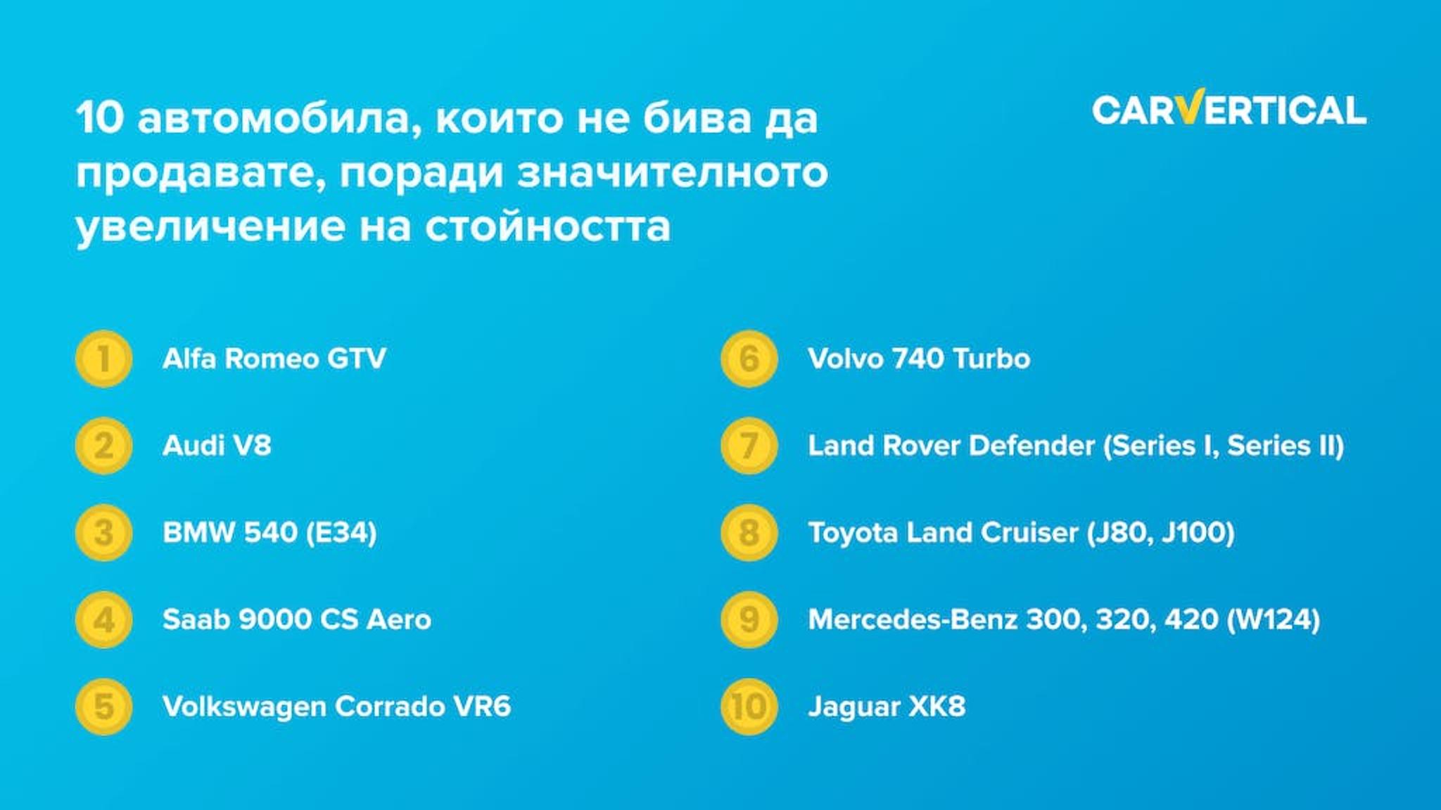 Експертите от регистрите за автомобилни истории carVertical анализираха автомобилния пазар и изготвиха списък с 10 коли, които не бива да продавате поради значителното увеличение на стойността им. Те също така използваха базата данни на carVertical, която съдържа хиляди доклади на автомобилни истории, за да изследват някои от статистиките за тези специфични модели. Ето финалния списък:
