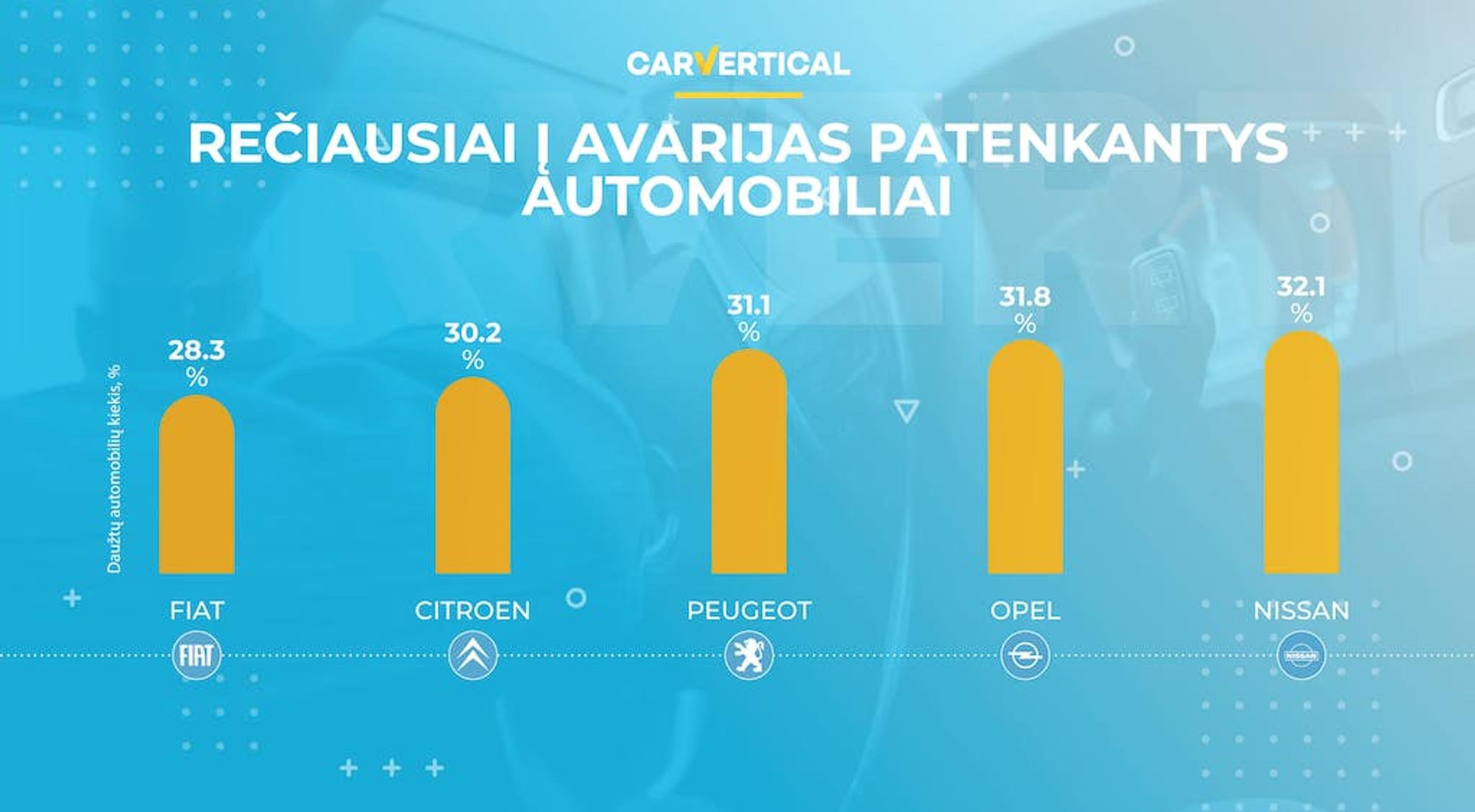 Žemiau esančiame grafike nurodytos penkios automobilių markės, kurios, pagal carVertical ataskaitų duomenis, turi didžiausią ankstesnių eismo įvykių tikimybę. Atkreipkite dėmesį į dažniausiai į modelius, nes visi automobiliai turi skirtingas charakteristikas ir yra mėgiami skirtingų vairuotojų.