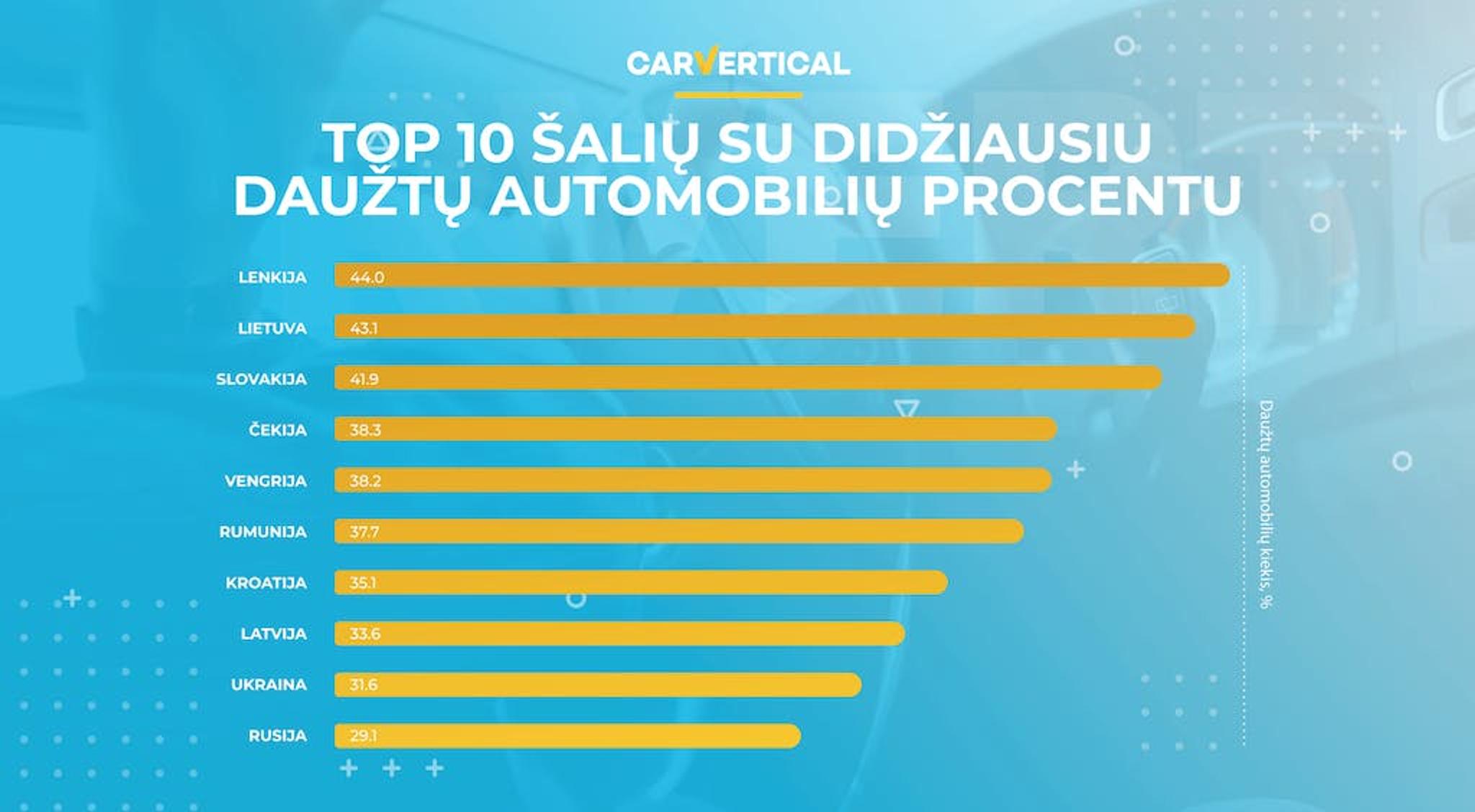 Tyrimo metu buvo analizuojamos carVertical automobilių istorijos ataskaitos iš skirtingų Europos šalių. Žemiau esančiame grafike matomos tos Europos šalys, kuriose daužtų automobilių procentas yra didžiausias.