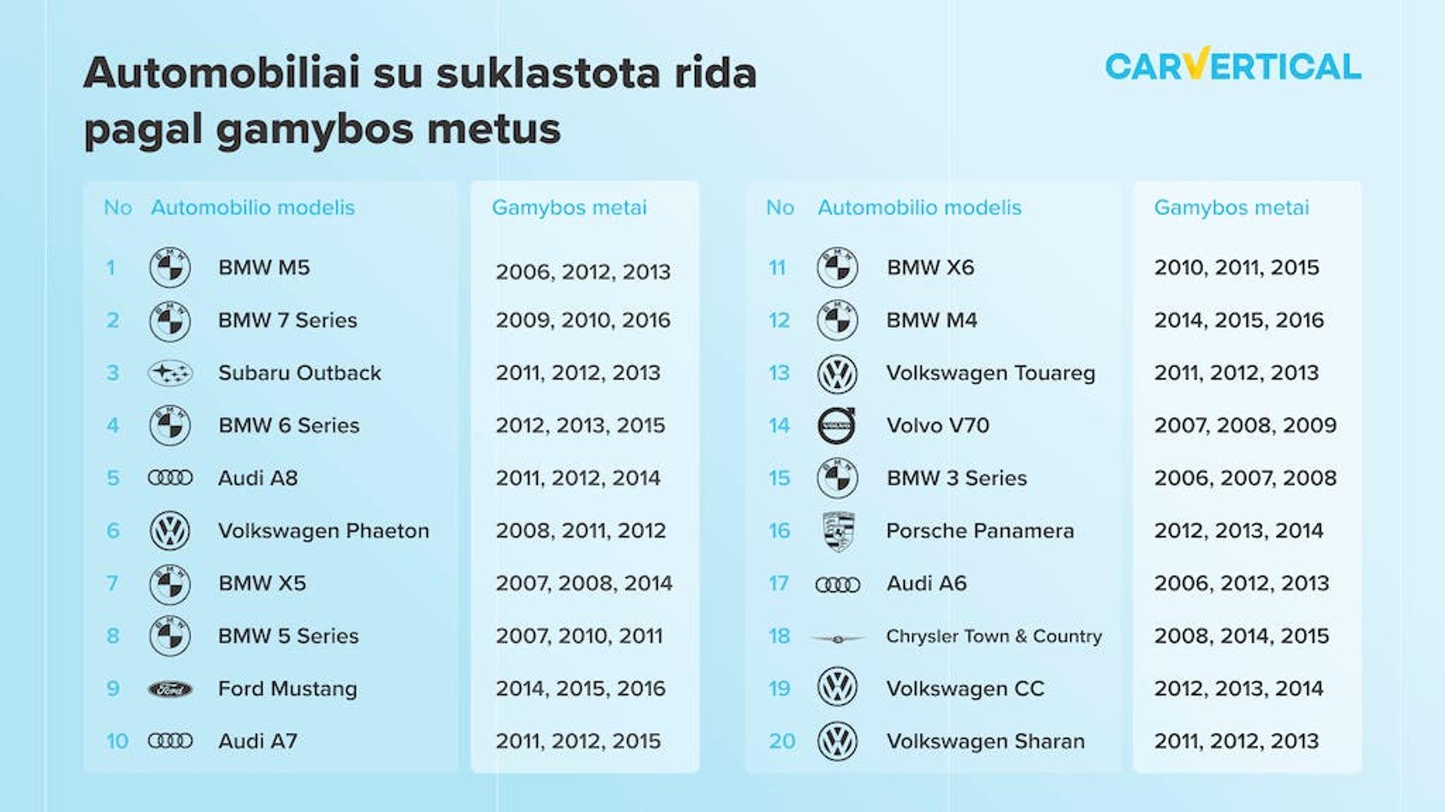 Dažniausiai suklastotą ridą turinčių modelių sąrašas pagal gamybos metus: senų automobilių rida klastojama dažniausiai