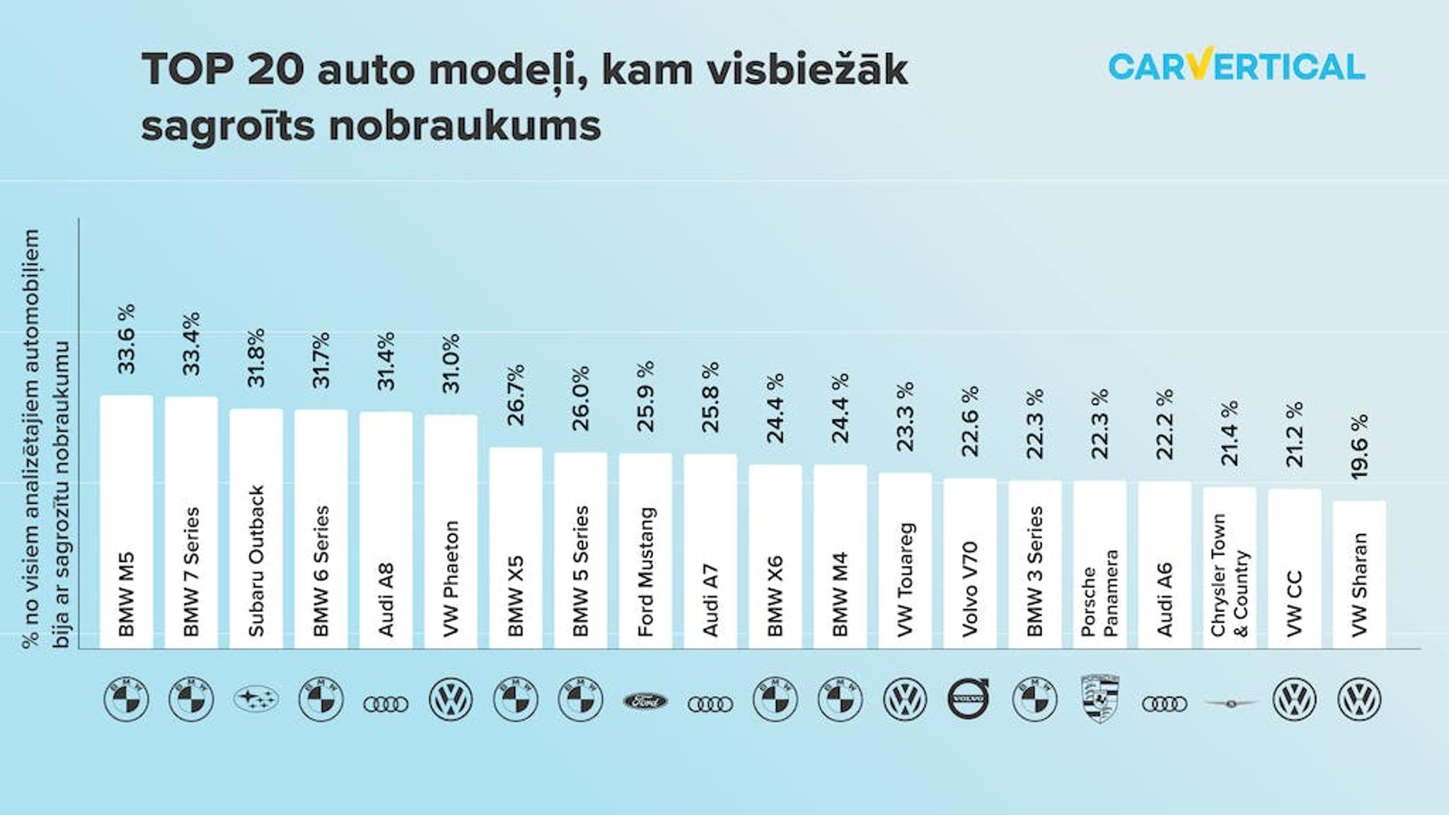 Kā liecina nobraukuma dati, BMW M5 ir automobilis, kam visbiežāk tiek sagrozīts nobraukums, un nedaudz vairāk kā trešdaļai pārbaudīto modeļu, iespējams, tas ir sagrozīts. Tomēr šie statistikas dati vēl neatklāj odometra attīšanas problēmu BMW automašīnām pilnībā - kā nesen norādīja carVertical automobiļu eksperts Matass Buzeļa kungs (Matas Buzelis), BMW automobiļi dominē šajā sarakstā: